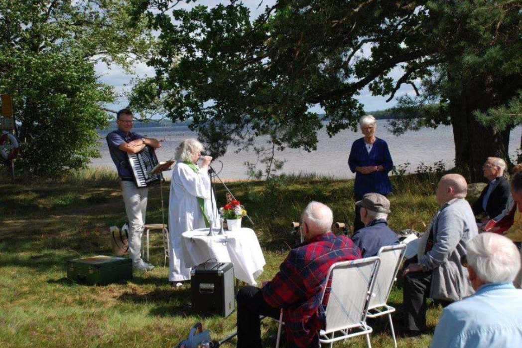 En söndag eftermiddag i augusti begav vi oss till Laxasand, då vi läst att en friluftsgudstjänst, arrangerad av Almundsryd kyrka skulle hållas. Vid srålande sol med blå himmel hade en liten krets församlat sig. Susann läste ur evangeliet, Vi bad en bön tillsammans och till Ulfs virurosa dragspel sjöng vi olika sommarpsalmer.