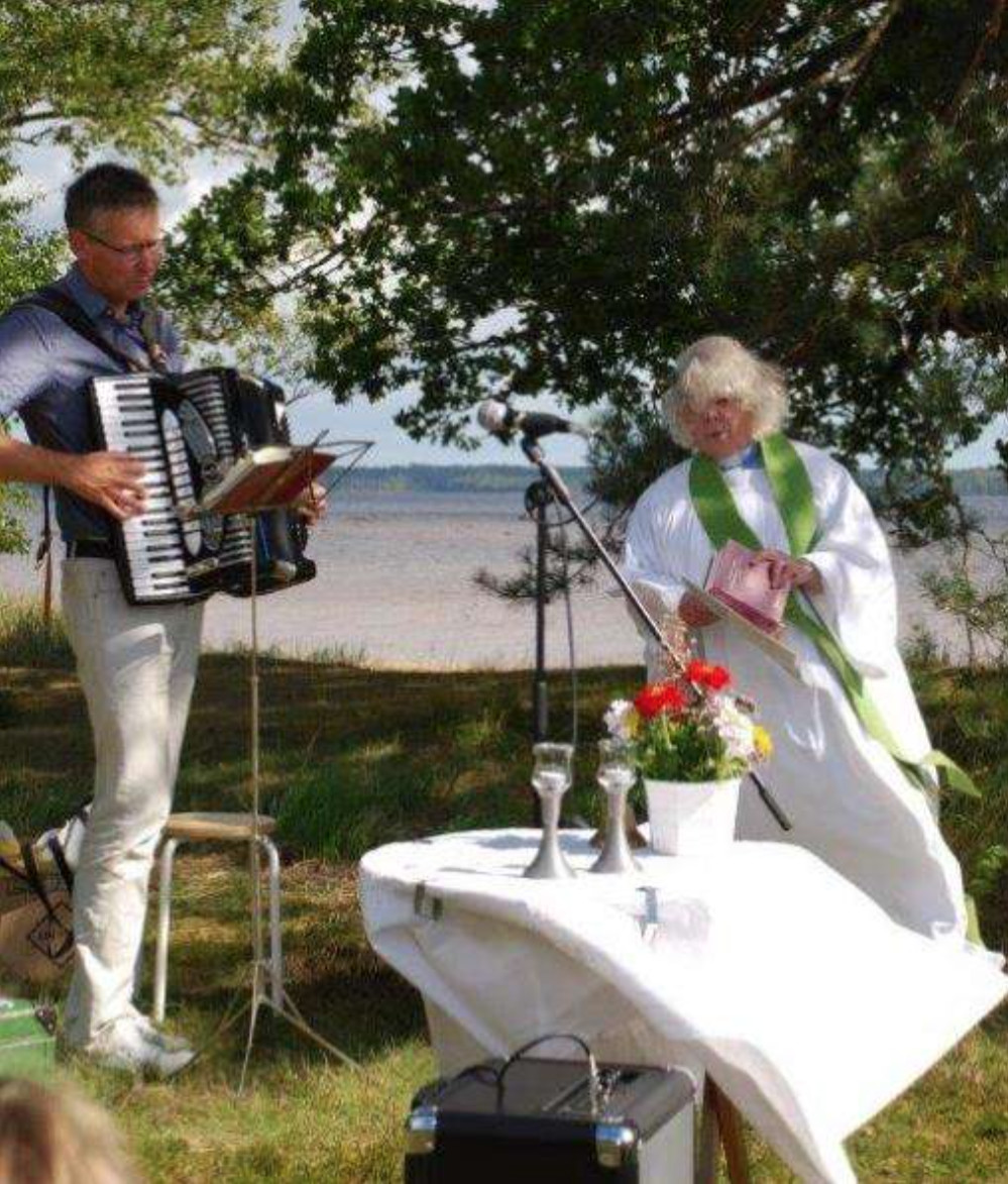 Vid srålande sol med blå himmel hade en liten krets församlat sig. Susann läste ur evangeliet, Vi bad en bön tillsammans och till Ulfs virurosa dragspel sjöng vi olika sommarpsalmer. Susann talade om gemenskapen. Mycket i livet handlar ju om gemenskap med andra och hur viktigt det är för var och en av oss. Att ta vara på ögonblicket just här och nu, och att kanske ibland känna tacksamhet.